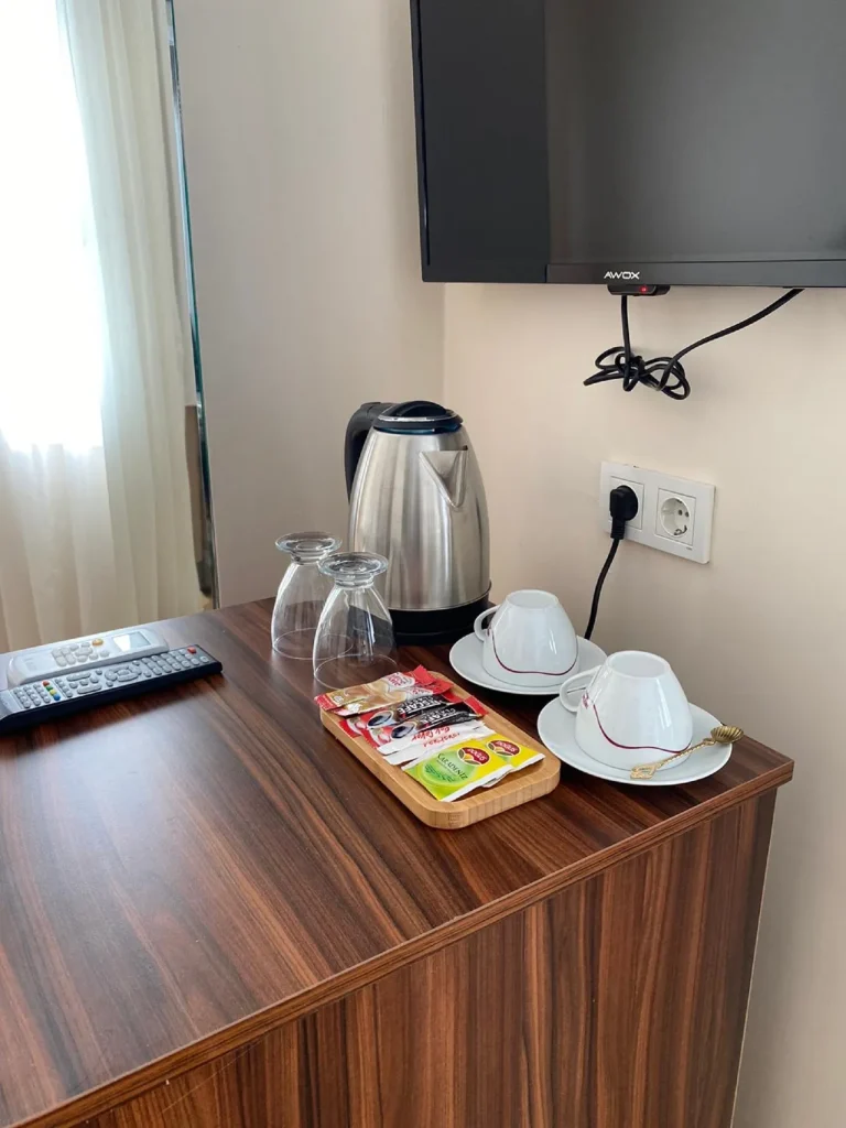 Deluxe odalarda ücretsiz olarak çay ,kahve , bitki çayları ve büyük su bulunmaktadır .